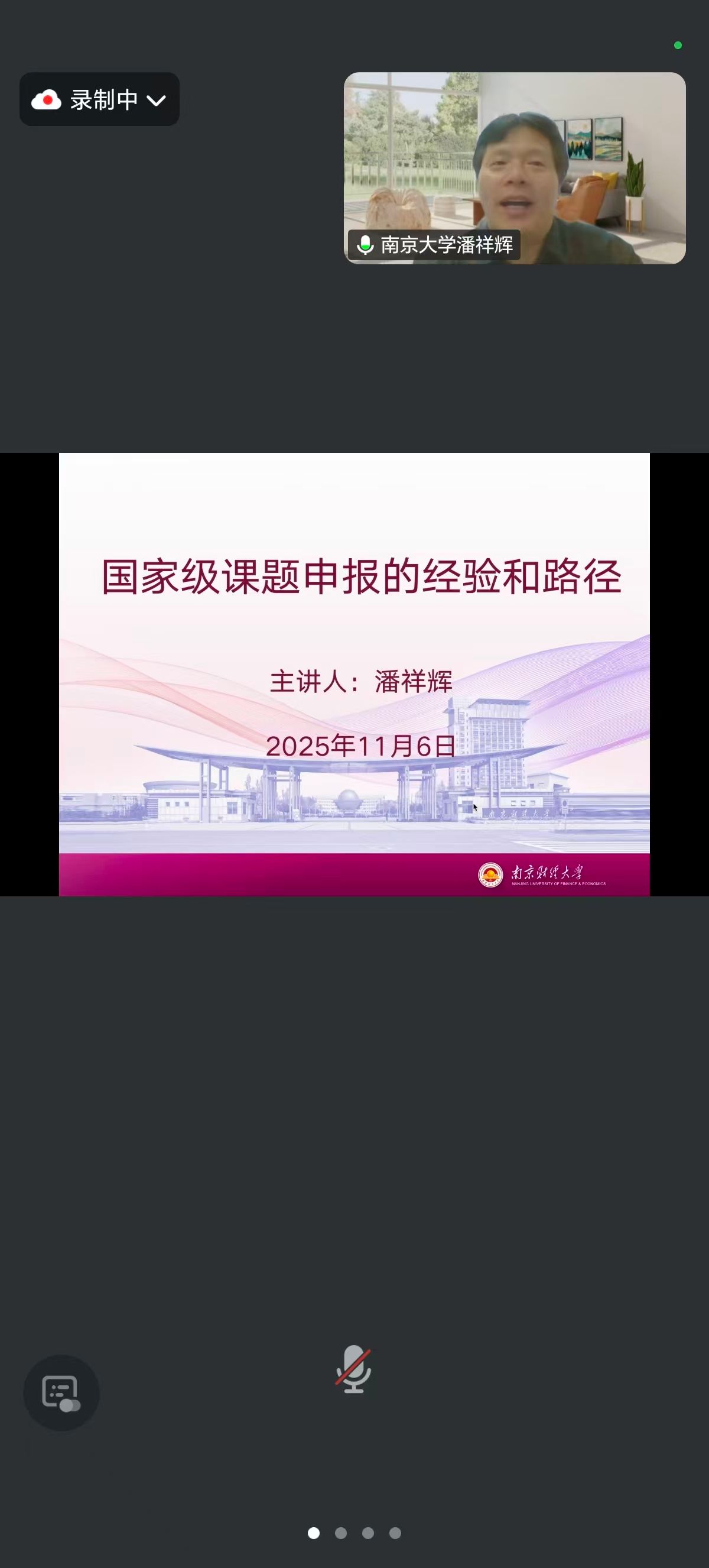 2025年11月6日晚,新闻与文化传播学院在腾讯会议举办主题为“国家级课题申报的经验和路径”的线上学术讲座,讲座由南京大学新闻传播学院教授、博士生导师潘祥辉主讲。新闻与文化传播学院院长刘泱育、副院长肖璐和青年教师参加了本次讲座,讲座由胡良益博士主持。