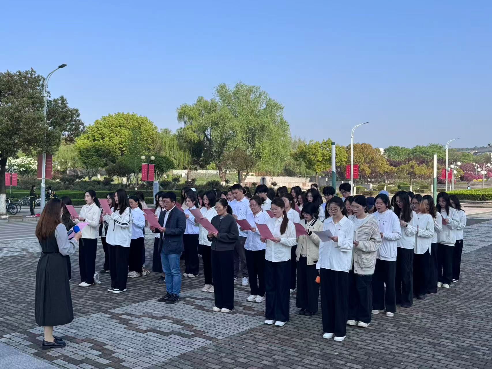 初心如炬,青年发声。在随后的环节中,三位青年代表依次发言,从不同视角诠释责任与担当。学生党员代表许芸分享了她的入党初心与成长体会,以实际行动诠释党员的先锋模范作用;党的发展对象代表宋圳讲述了向党组织靠拢的思想历程,并作出庄严承诺;新一期“青马班”学员代表陈歌围绕马克思主义理论学习与社会实践,畅谈心得与展望。真挚的讲述深深感染了在场师生。