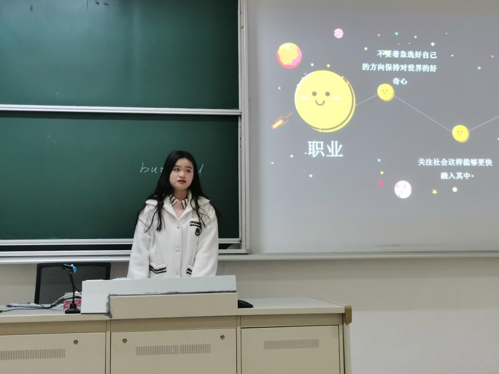 杨玉婷还在职业方面做出分享。她向同学们分享了自己参与社团,志愿者服务的经验,为同学们提供的示范性的典例,她鼓励各位新生们要积极参与社团活动,加入集体,走出自我,努力学习ps、pr技术,提升自我。